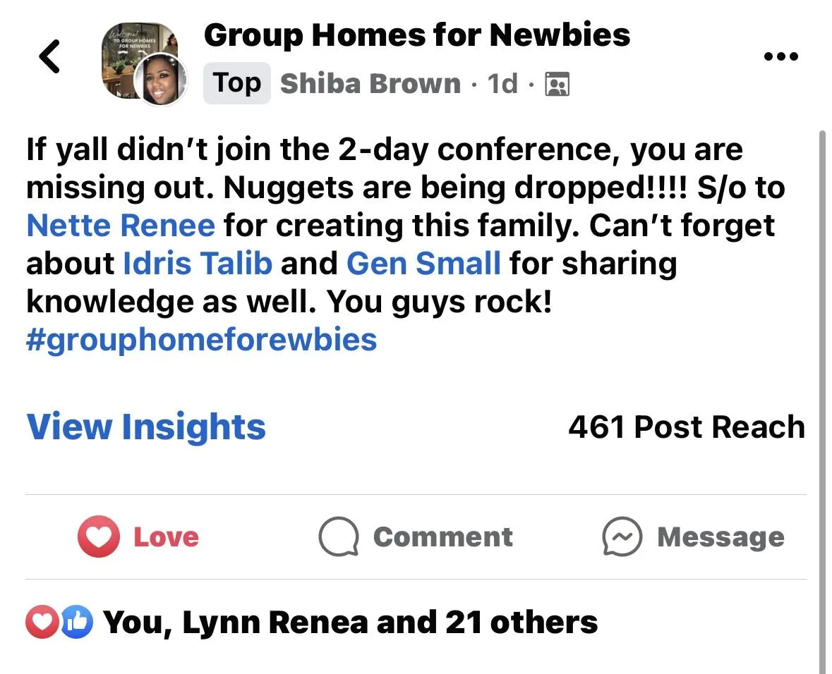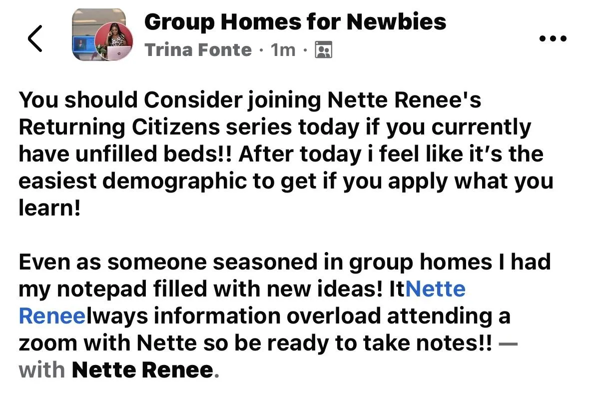 80,000+ person community of aspiring and current group home operators who turn to her for guidance